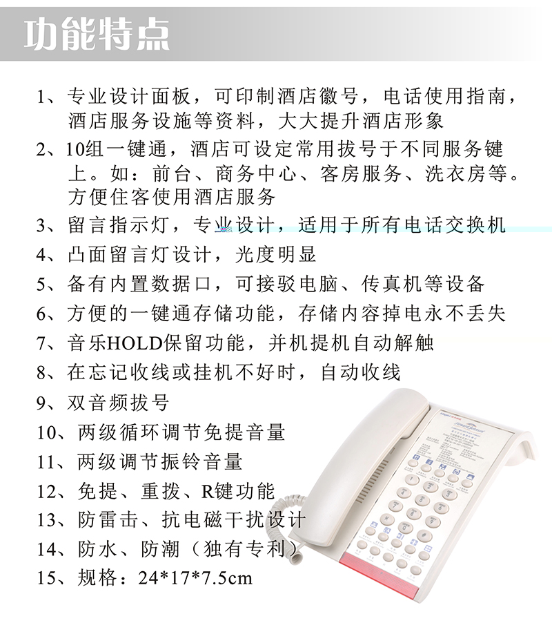 2、10組一鍵通(服務(wù)鍵),酒店可設(shè)定常用拔號(hào)于不同服務(wù)鍵上。如:前臺(tái)、商務(wù)中心、客房服務(wù)、洗衣房等。方便住客使用酒店服務(wù)