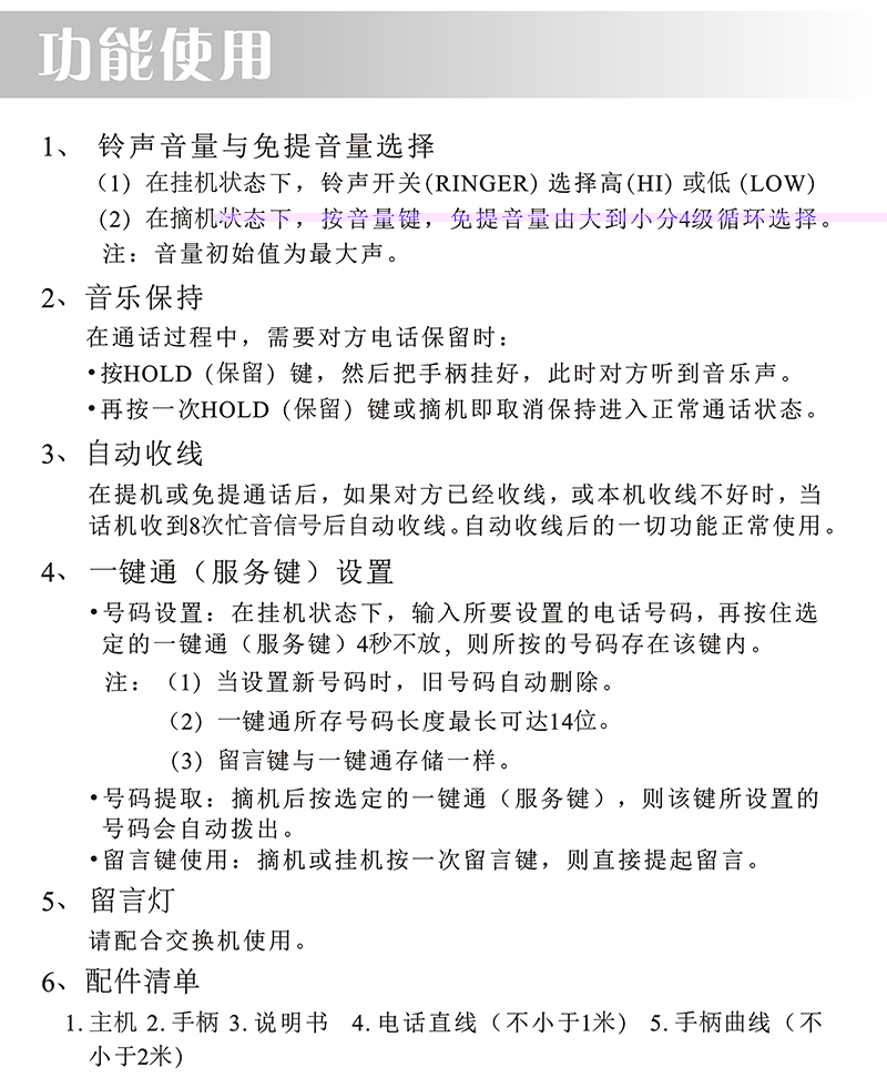7、音樂保留(3級音量可調(diào)),并機(jī)取機(jī)自動解除保留